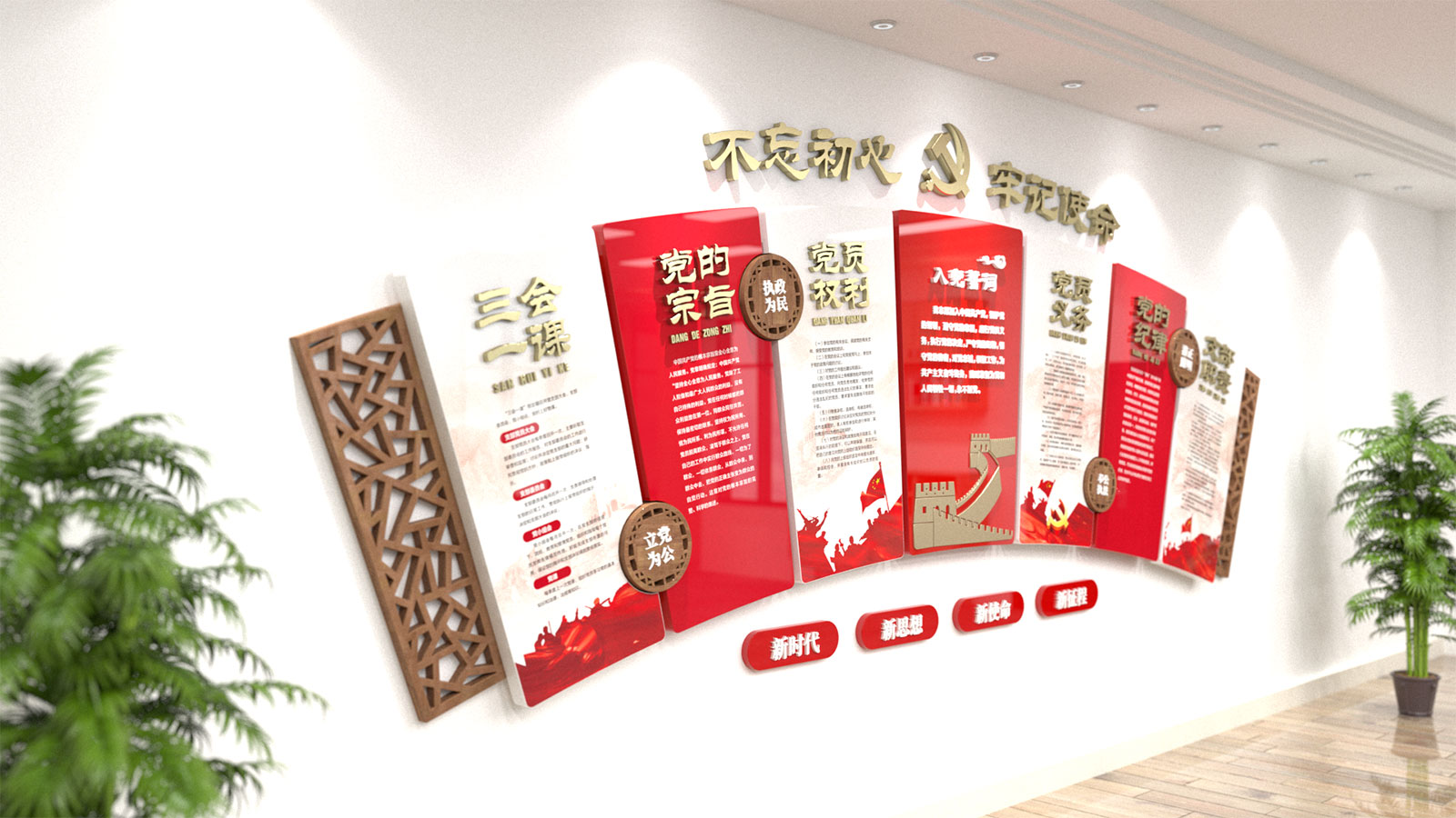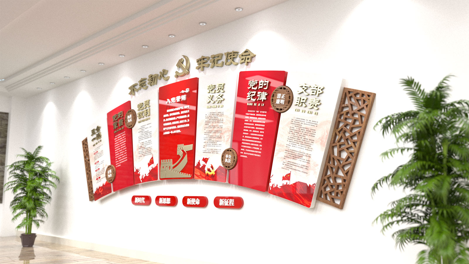黨建文化墻可將黨史、黨建、廉政、活動等板塊與黨建文化系列之應用場景進行巧妙設計之后,變成融合一體的系列文化宣傳工具。