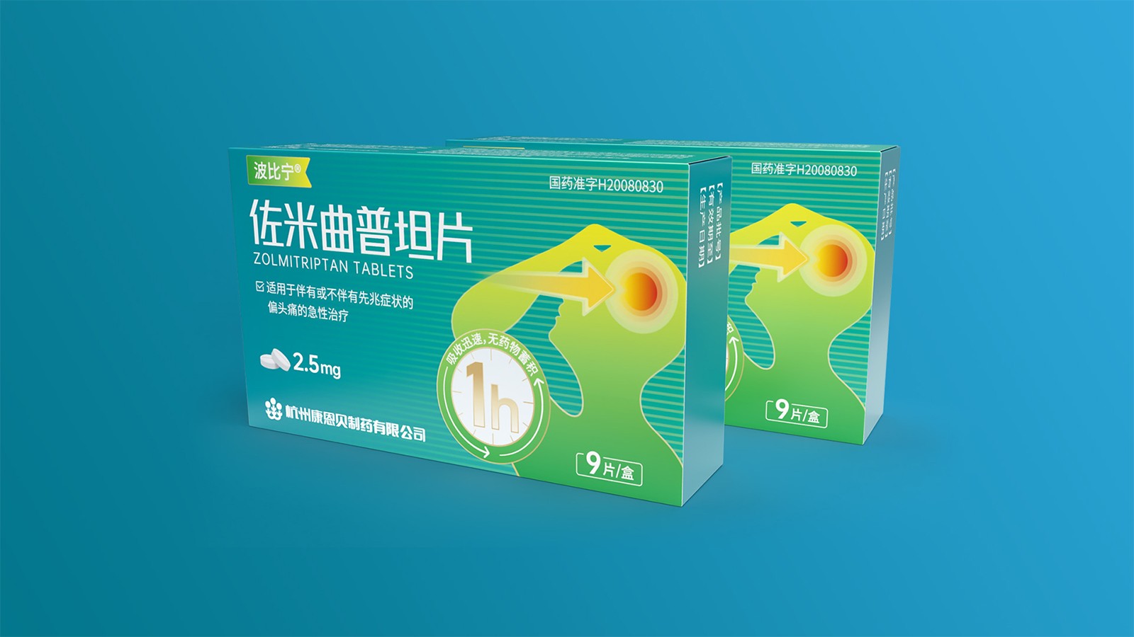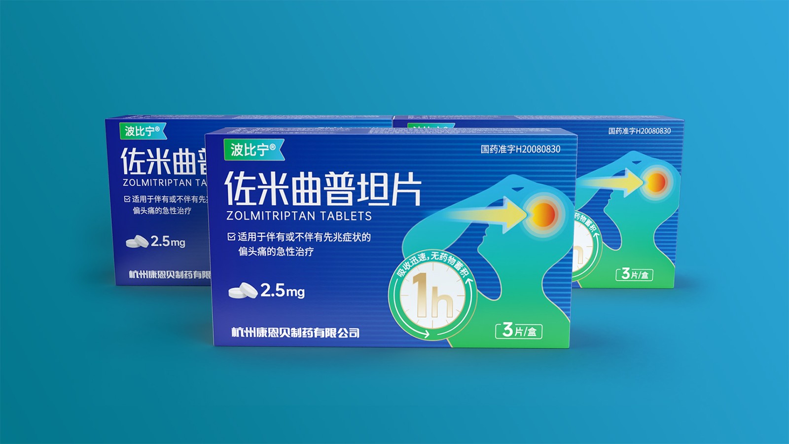石特綜合考慮產(chǎn)品的使用場(chǎng)景、產(chǎn)品功效、消費(fèi)者心理等因素并結(jié)合創(chuàng)意對(duì)藥品的包裝設(shè)計(jì)提出方案。對(duì)于佐米曲普坦片的包裝,以藍(lán)色為主色,藍(lán)色寓意健康,添加人體頭部剪影并展示頭痛癥狀,可以凸顯藥品的功效,被放大的1h也可以告訴人們?cè)撍幤返囊?jiàn)效快速。