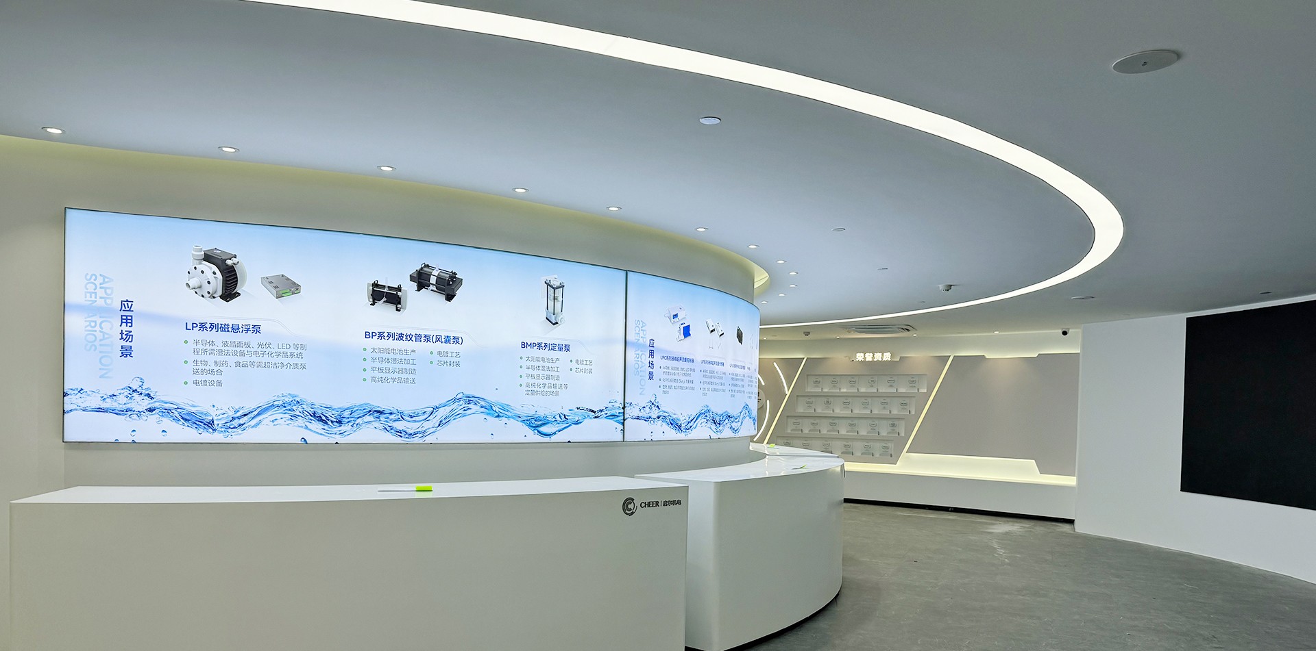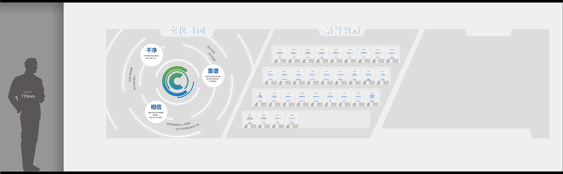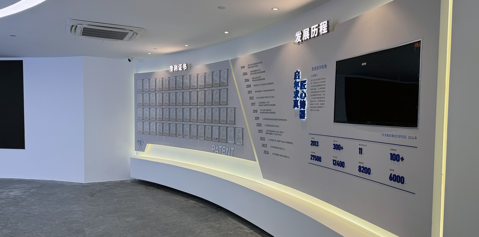 2. 序廳(品牌形象區(qū))設(shè)計元素:采用高科技感的LED大屏播放公司宣傳片,結(jié)合動態(tài)光影效果,營造震撼的視覺效果。墻面設(shè)置企業(yè)形象墻,展示公司歷史沿革、榮譽獎項及核心團隊介紹。亮點:設(shè)置AR互動裝置,參觀者可通過手機或特定設(shè)備掃描二維碼,虛擬體驗公司發(fā)展歷程中的重要時刻。