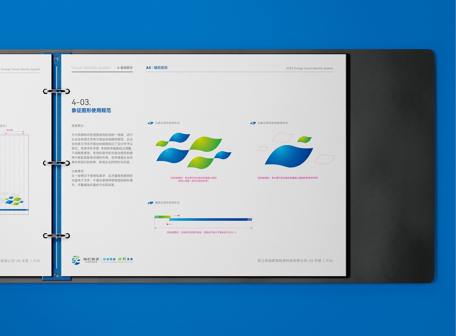 商儲數智能源視覺識別系統,通過嚴格標準化的語言和系統化的視覺符號,將商儲數智能源的服務宗旨、行為和功能傳送給社會公眾,具有突出商儲數智能源服務的功能,起到強化品牌形象的作用。標志釋義:1、以字母 S和負形 C 為主體,結合業務的儲能模塊,形成的圓,代表著我們為之奮斗的事業,整體壁合天成,獨具匠心,向世界展示了作為儲能企業自信的一面--數智商儲,能創未來。 2、筆畫模塊交錯平行,代表我們深耕技術,創新產品,同時也展現了我們縱橫天下,行道載道的胸襟與志向。 3、設計中巧妙運用正形和負形的互換,以及視覺的連貫性,既體現了“閃電”的符號之美,又使圖形結構氣脈疏通,代表了我們開拓創新的意向。 4、中部的靈動的綠葉,一則點明我們的綠色能源屬性,二則蘊含飄揚的旗幟之意,代表著我們將高舉行業旗幟,為用戶提供一流的產品和解決方案,三則如同車窗造型,代表我們的事業是溝通能源事業的窗口。 5、品牌標識整體采用左右對稱的布局,左右均衡平穩,中間略微傾斜,產生動態的前進感,嚴謹容,動靜兼備。色彩源自科技的藍色代表了信守與創新,源自能源的綠色,代表了生命與傳承。
