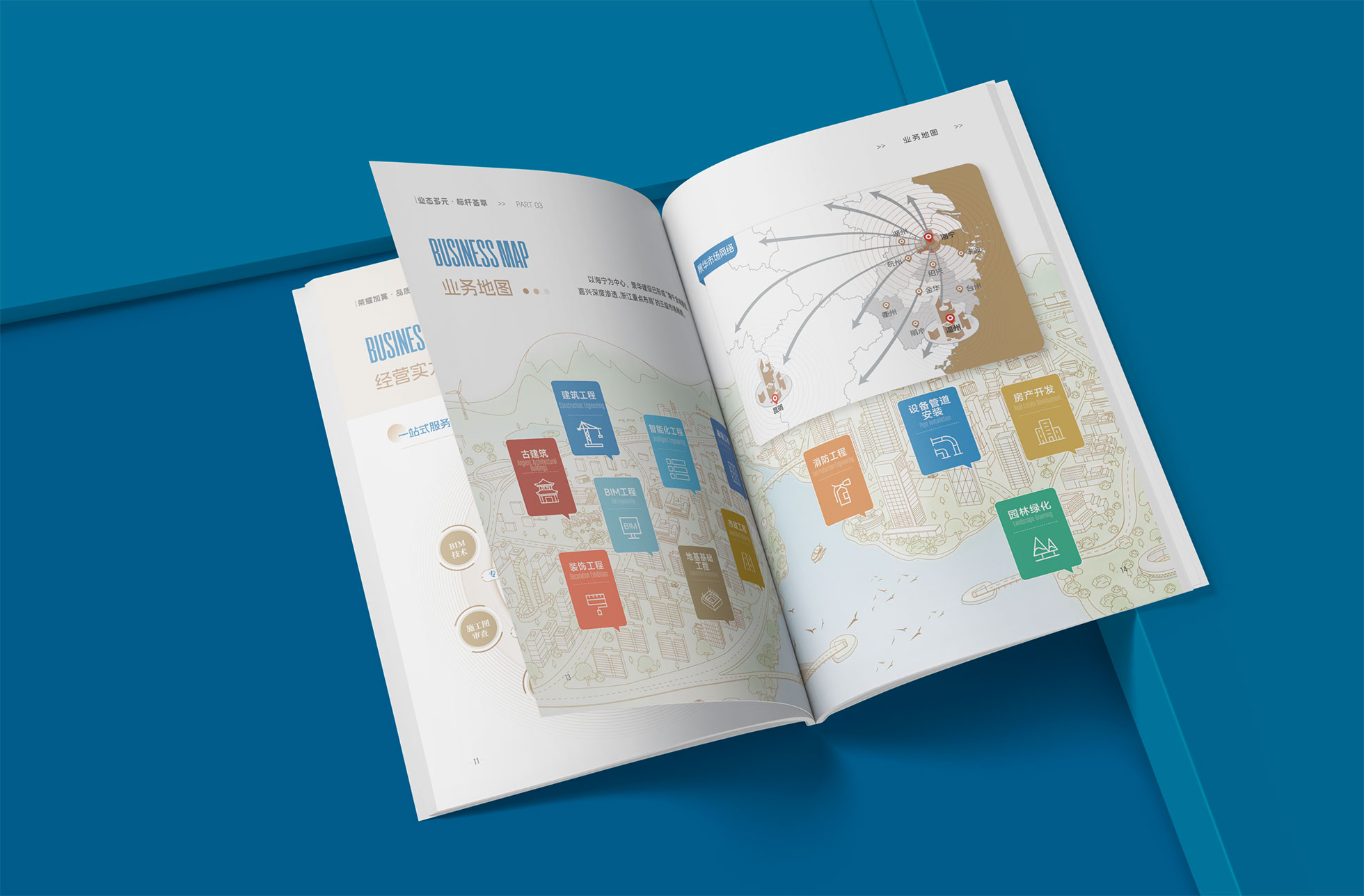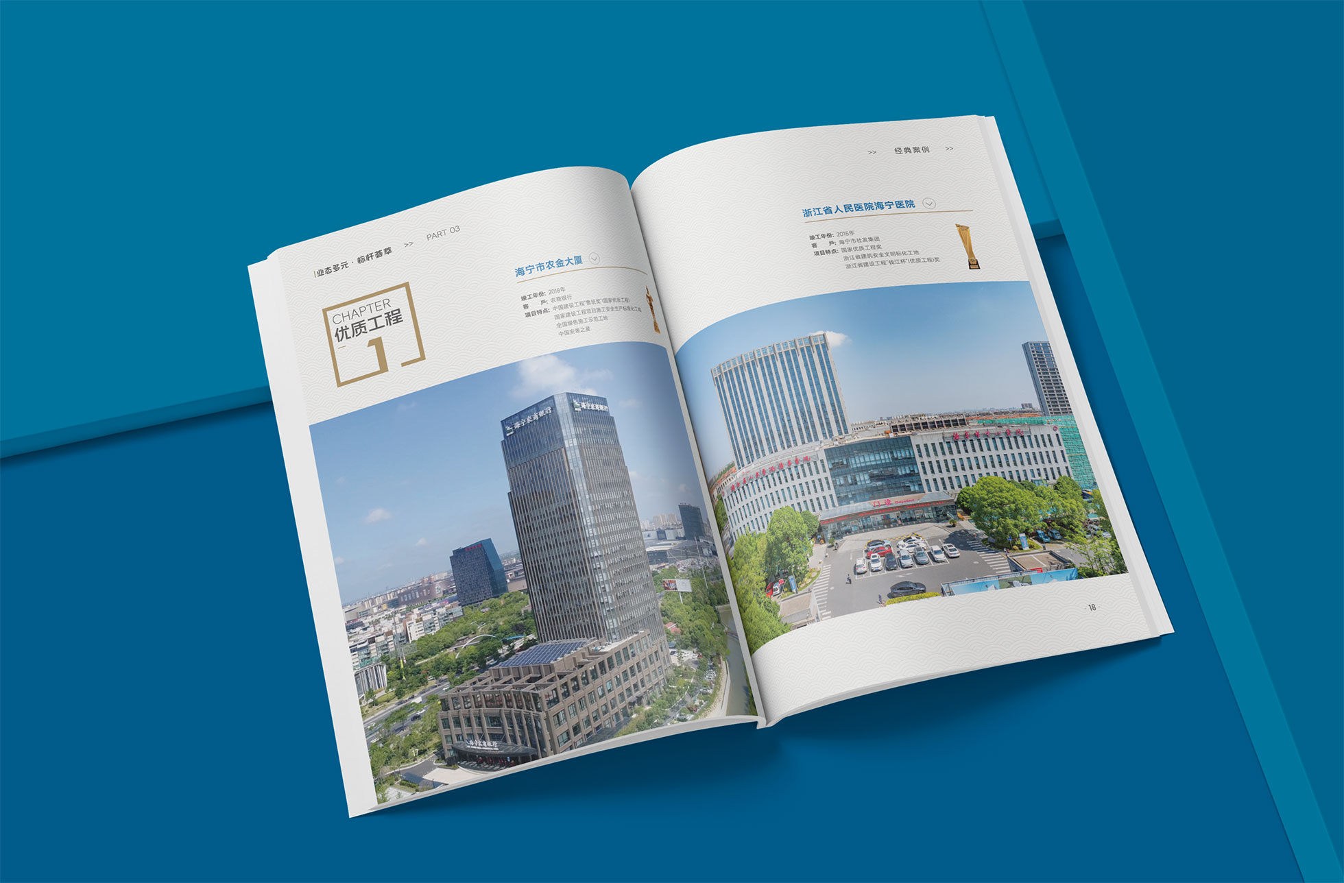 結構化信息設計與高效閱讀: 針對建筑行業信息量大的特點,運用清晰的信息層級、圖標化歸納與數據圖表,將復雜的企業資質、技術參數等內容進行可視化處理,極大提升了畫冊的可讀性與信息檢索效率,方便客戶快速了解企業核心優勢。
