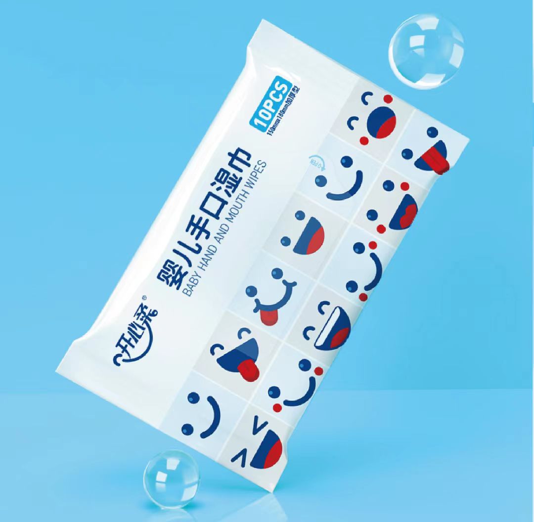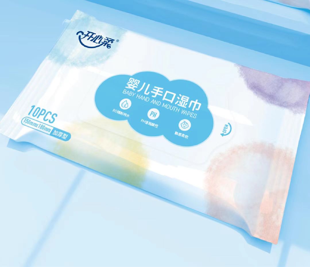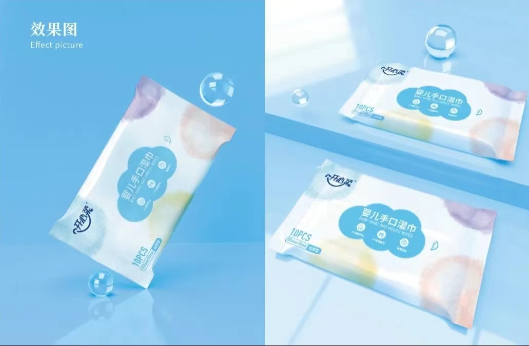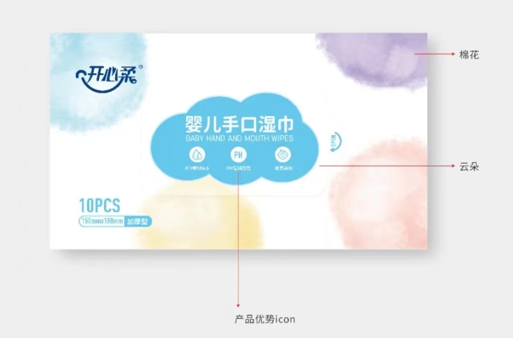 與一般嬰兒濕布相比,嬰兒手口濕巾殺菌和消毒作用更強,手口濕巾受到廣大消費者的歡迎,開心柔嬰兒手口濕巾采用新型技術,觸感柔軟舒適,PH值更貼近嬌嫩肌膚,為了能夠拉近與消費者的距離,擴大產品銷量,增強品牌影響力,石特受委托為嬰兒手口濕巾設計包裝。