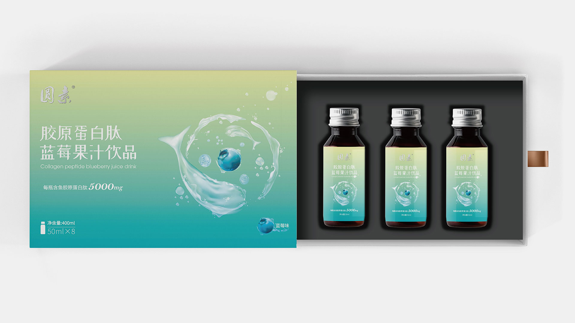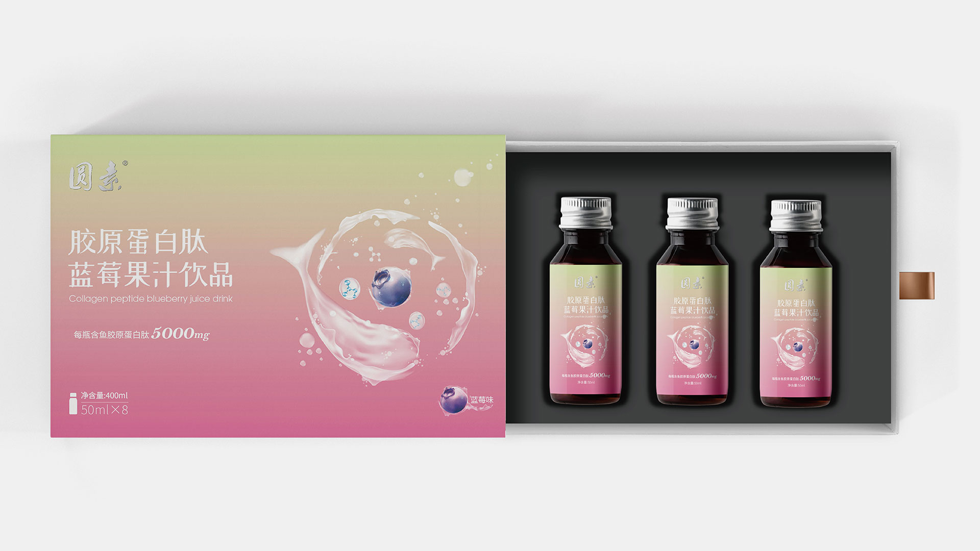 為能更好的突出藍莓濃縮果汁產品特性,根據品牌調性,石特在包裝上提出兩種方案:方案一:該款包裝以深海魚環繞藍莓游泳作為主畫面,其中深海魚以水狀的形態進行呈現,水滴融入分子式的元素,凸顯果汁飲品成分提取自深海魚的魚膠原蛋白;同時選取藍紫漸變色作為主色調,年輕且時尚,包裝整體干凈簡潔。