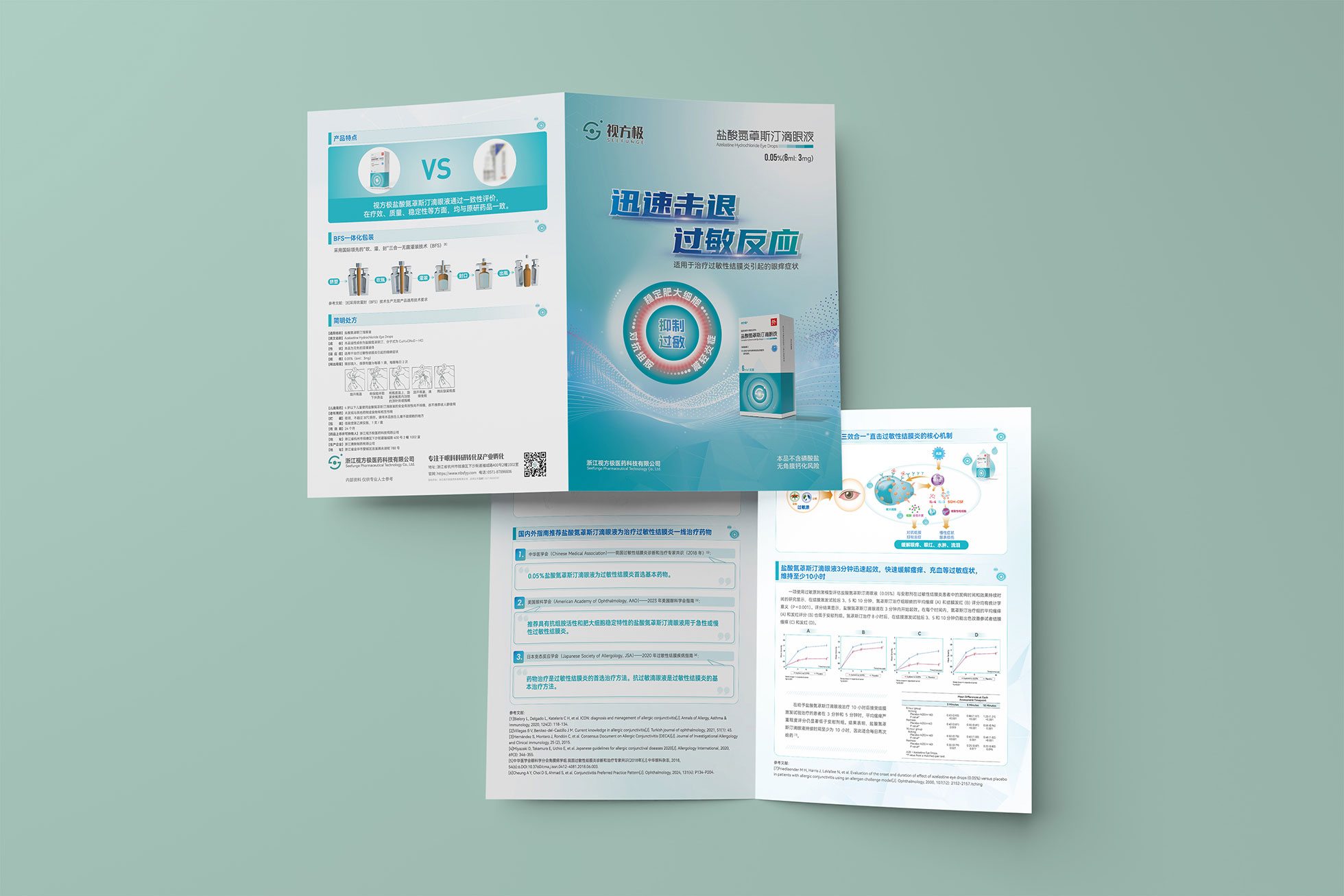 本項目是石特大健康為浙江視方極醫藥科技有限公司的核心產品——鹽酸氮?斯汀滴眼液,所提供的從終端包裝到專業DA(Detail Aid) 的一站式整合設計服務。該產品用于治療過敏性結膜炎,其市場成功既依賴于在藥店貨架上對消費者的直接吸引力,也離不開面向眼科醫生的專業學術推廣。我們的挑戰在于,如何構建一個統一的品牌視覺體系,使其在包裝上能清晰傳遞產品功效、激發購買欲望,同時在DA上能專業地呈現藥物機理和臨床優勢,成為醫生可信賴的處方依據,最終實現“藥店動銷”與“臨床推廣”的雙輪驅動。